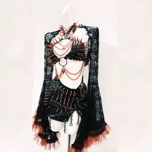 Long flared sleeve halter PU leather o ring rivet mini skirt set