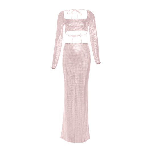 Long sleeve solid hollow out round neck ruched crop top skirt set-final-sale
