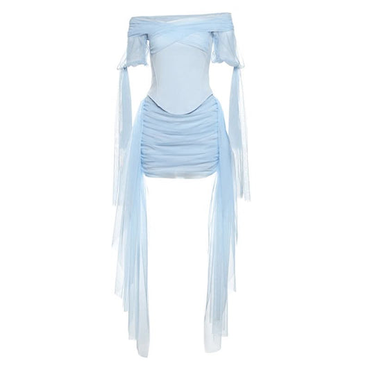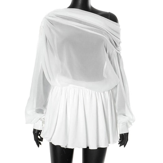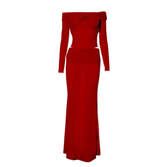 Off shoulder long sleeve ruched sheer mesh maxi skirt set