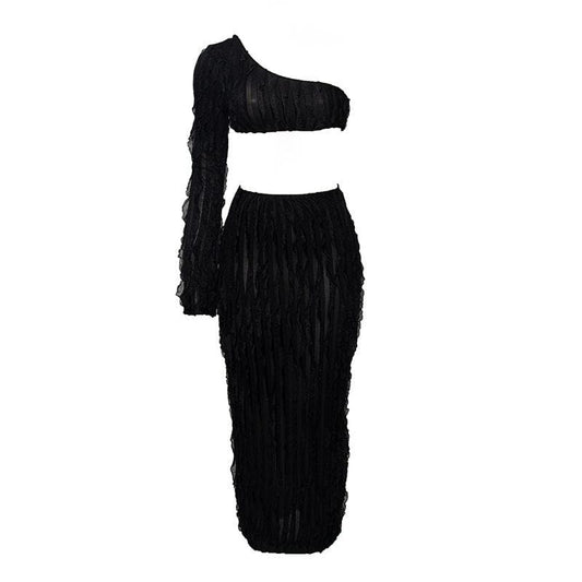 One shoulder long sleeve irregular ruffle textured maxi skirt set