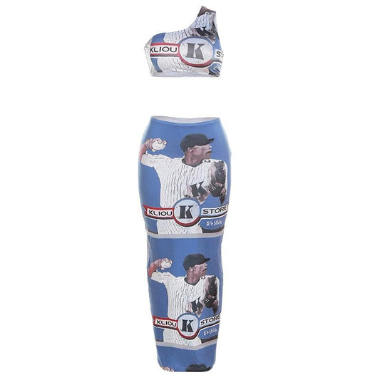 One shoulder irregular sleeveless contrast print slit maxi skirt set-final-sale