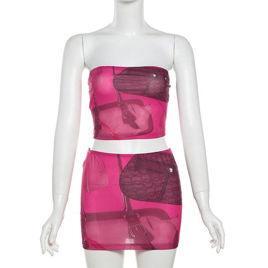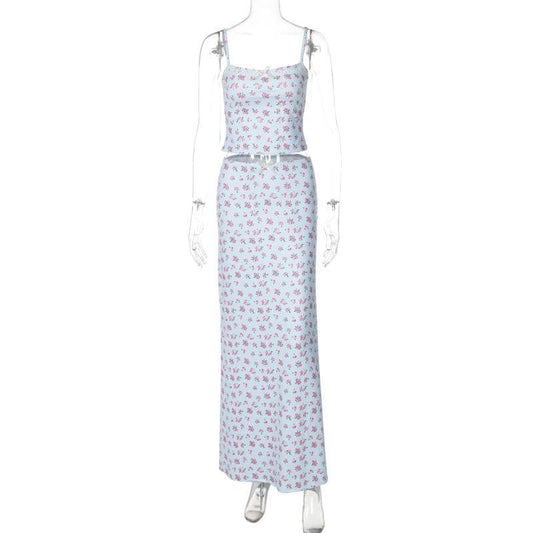 Print ruched high slit sweetheart neck mesh cami maxi skirt set