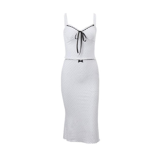 Polka dot v neck bowknot self tie lace hem midi skirt set