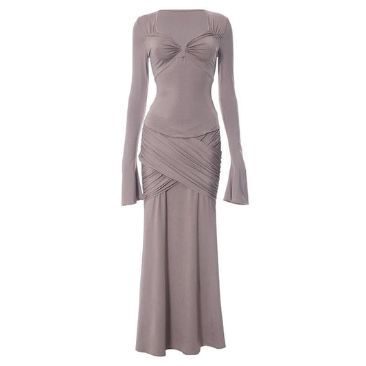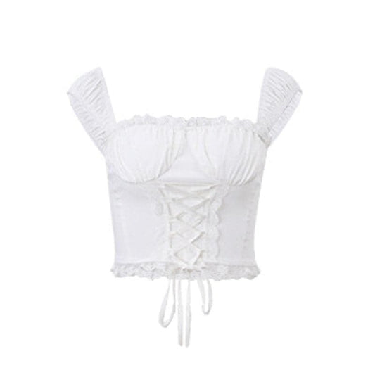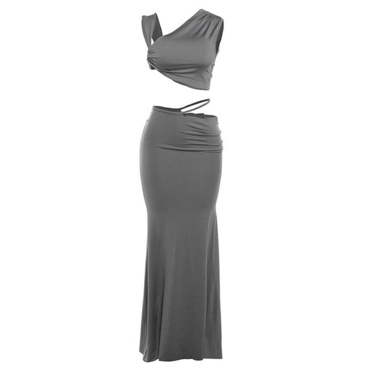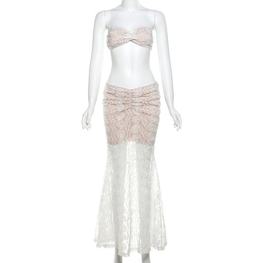 Ruched lace up lace hem patchwork square neck maxi skirt set
