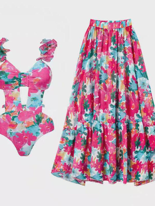 Ruffle Cutout Buckle Bodysuit With Mesh Skirt Swimsuit Set