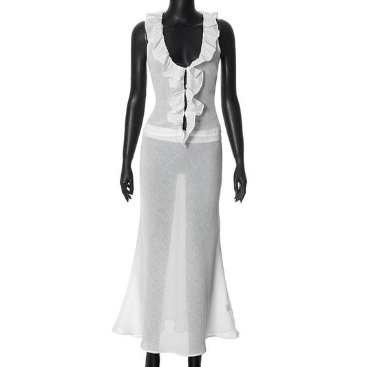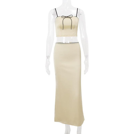 Ruffle knotted zip-up contrast cami maxi skirt set