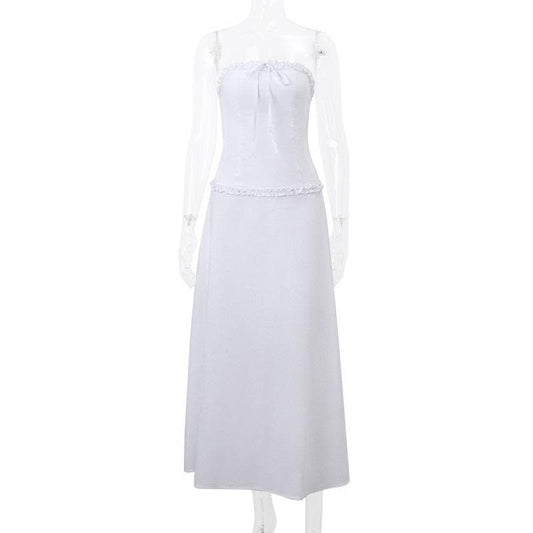 Ruffle bowknot smocked zip-up backless solid tube midi skirt set