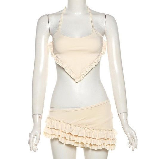 Ruffle halter self tie irregular u neck 3 piece mini skirt set