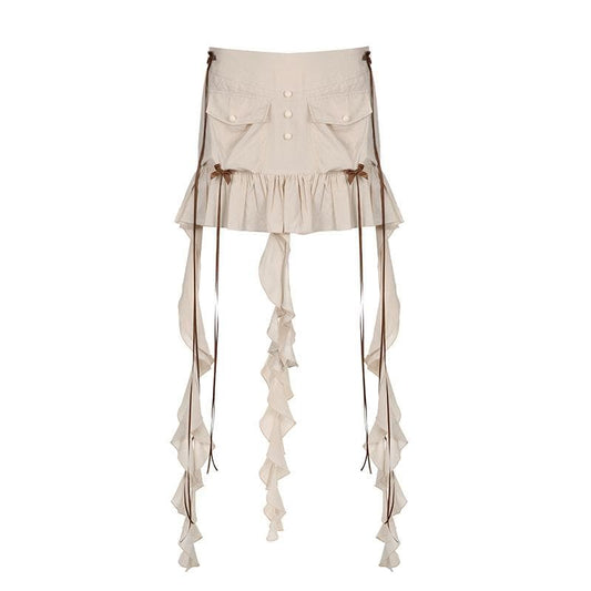 Ruffle ribbon zip-up bowknot button pocket mini skirt