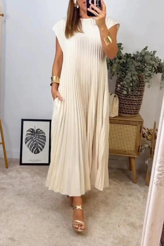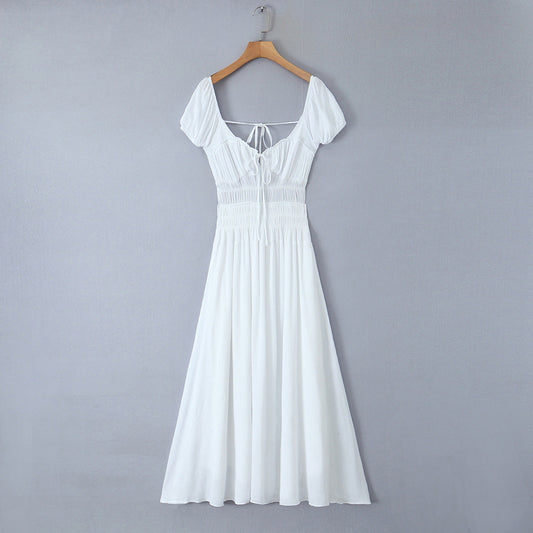 Deep V Neck Short Sleeve Pleated High Waist Slit Party Evening Dress Solid Color Dress