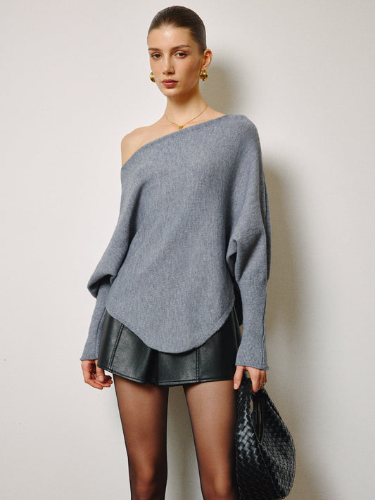 Oversized Asymmetrical Neck Leg-Of-Mutton Sleeve Sweater