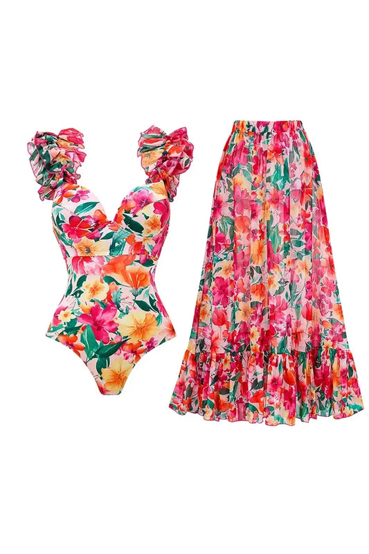 Dragonfly V Neck Cutout Skirted Swimsuit Set