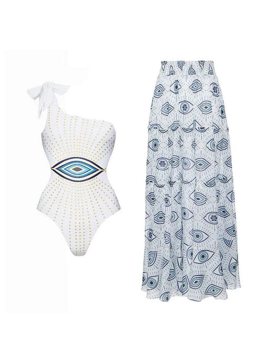 Evil Eye Print Ruffle One Shoulder Swimsuit & Skirt Coord Set