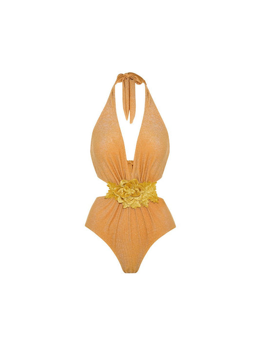 Halterneck Flower Applique Cutout Swimsuit & Skirt Coord Set