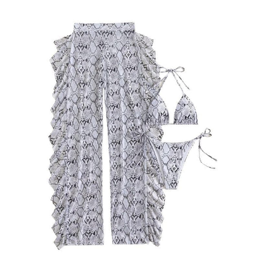 Snakeskin ruffle mesh halter self tie pant 3 piece swimwear