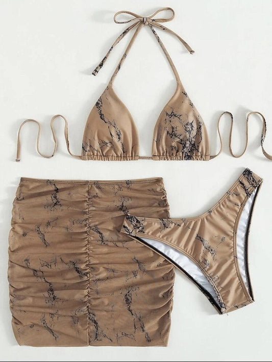 Abstract print contrast halter self tie 3 piece swimwear