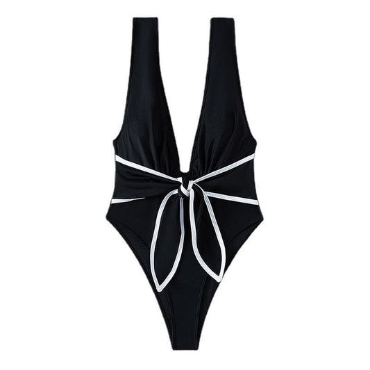 V neck sleeveless knotted contrast one piece swimwear