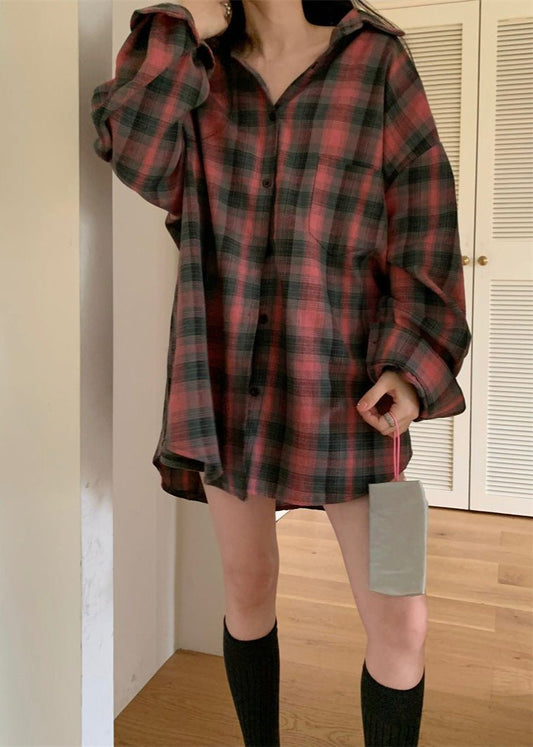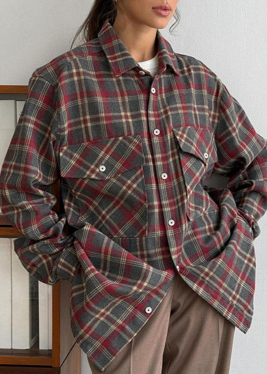 Retro Plaid Loose Shirt - Lapels, Long Sleeve with Pocket