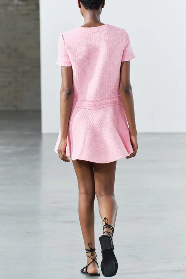 A cropped textured dress inspired by iconic silhouettes from the 1960s. Its refined design features tailoring details such as the bias-cut skirt, off-the-line raw trim at the collar, sleeves and waist, and gold-button fake pockets on the front; a sophisticated dress that blends classic and contemporary elements.