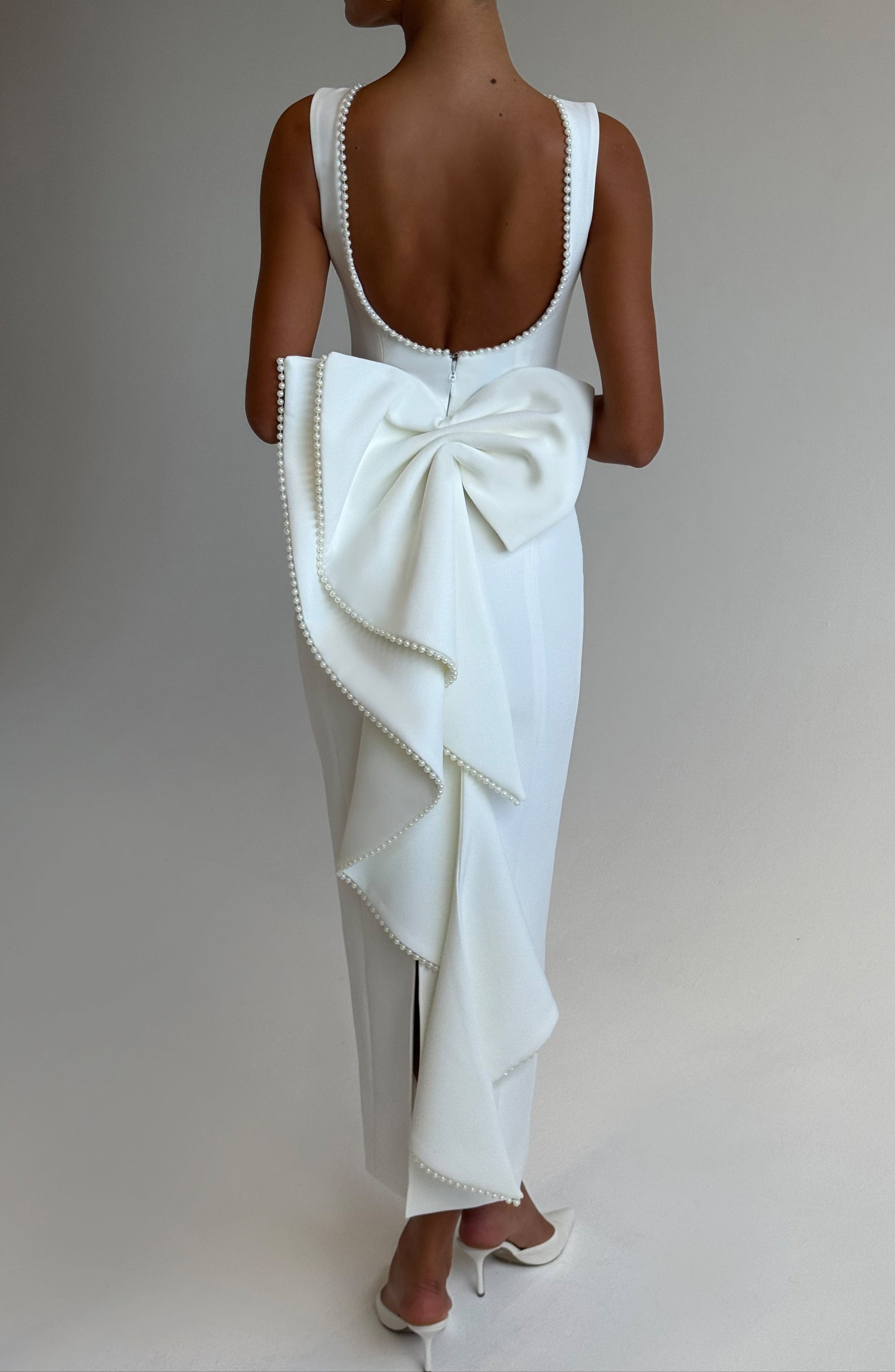 Timeless Sophistication – The Lana Midaxi Dress in ivory exudes effortless elegance with its high boat neckline and delicate pearl trim, creating a refined silhouette. The column-shaped skirt flows gracefully, enhanced by a subtle back slit for movement and allure—perfect for weddings, galas, or formal evenings.