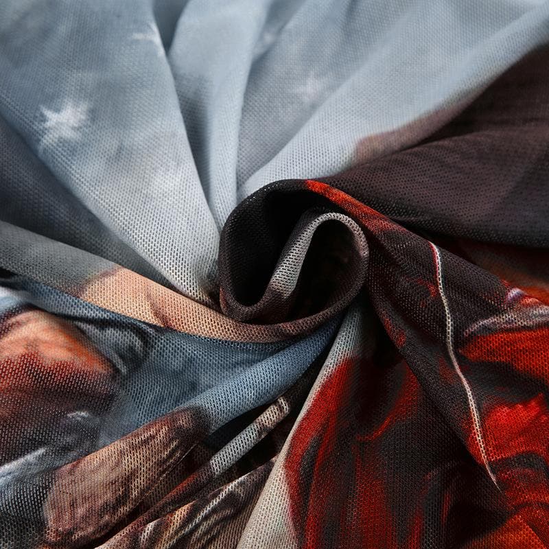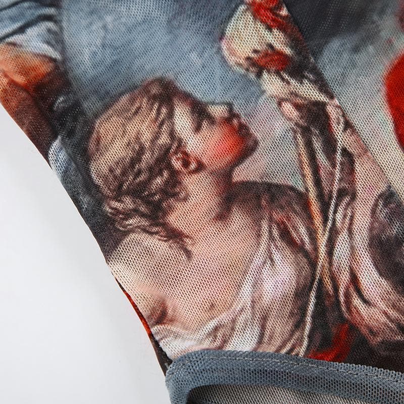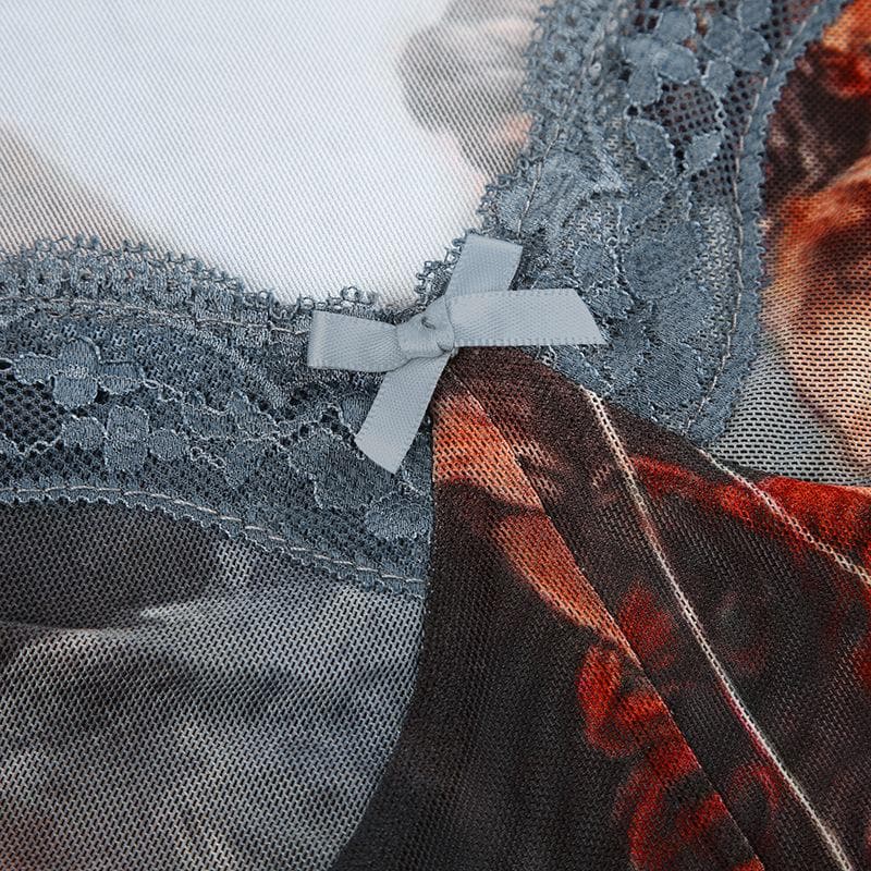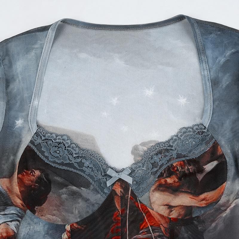Abstract contrast mesh long sleeve lace hem bodysuit