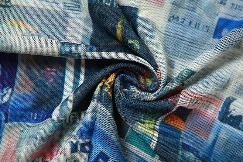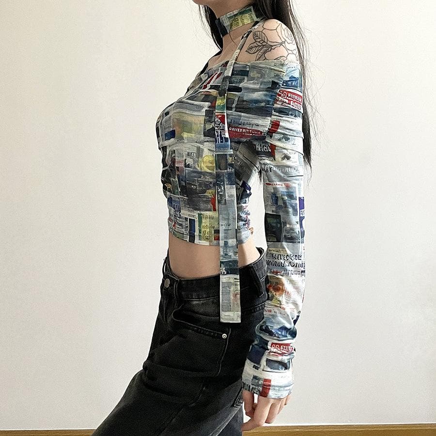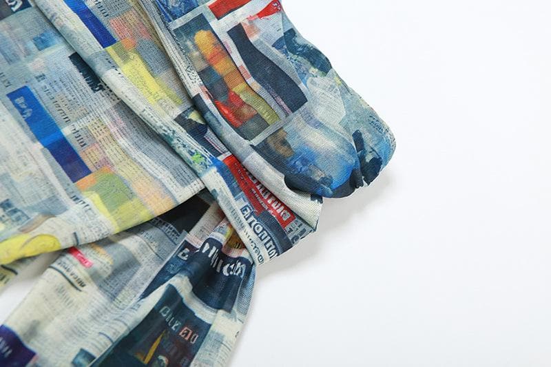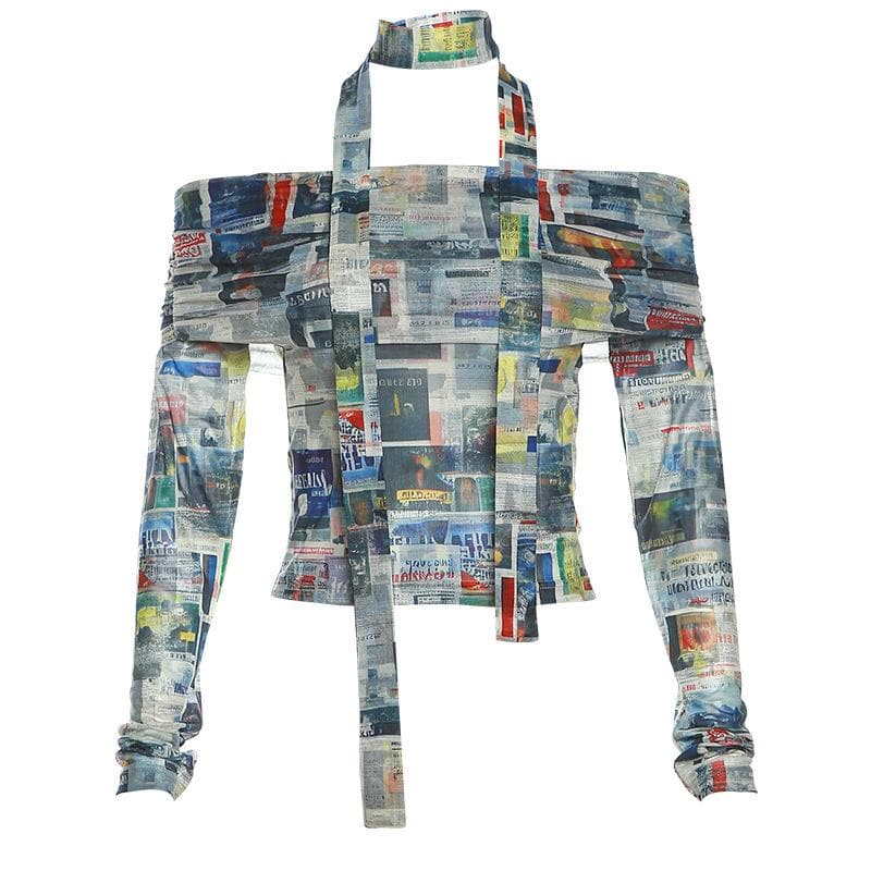Abstract mesh off shoulder ruched long sleeve contrast top