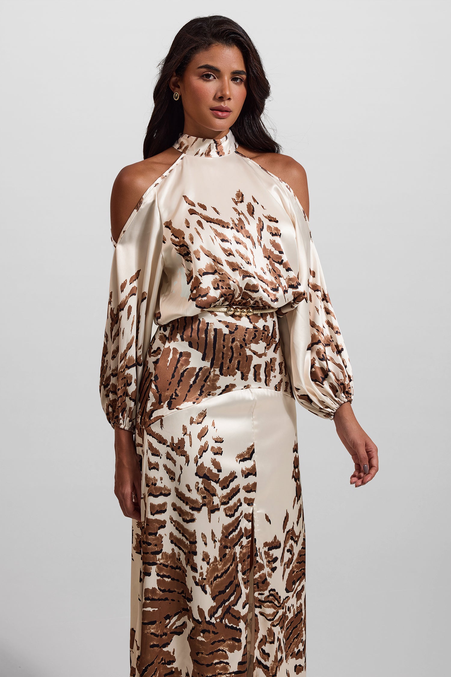 Abstract Print Cut-Out Puff Sleeve Maxi Dress