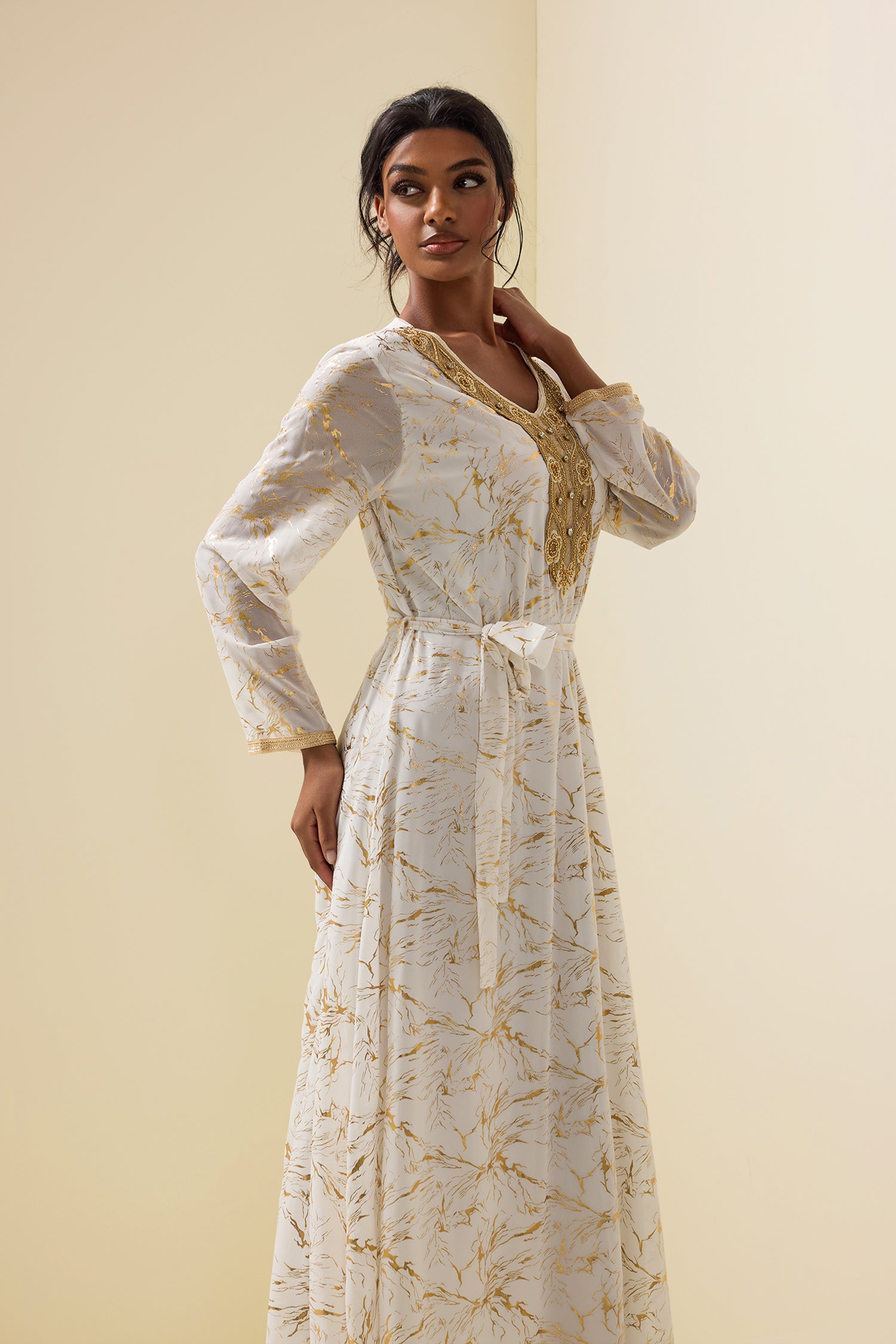 - Abstract print, gold foil, long sleeve, midi dress