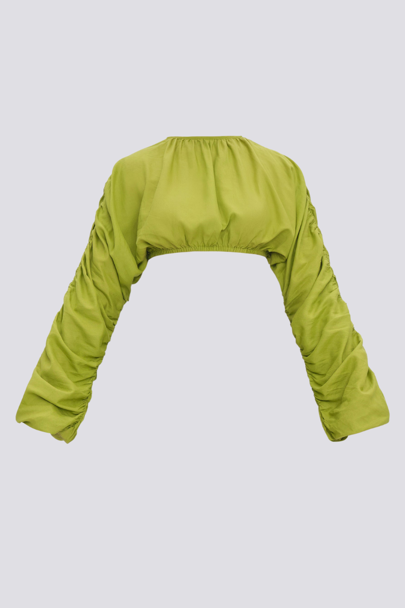- Design: Two-piece set with a round-neck top and pleated long sleeves