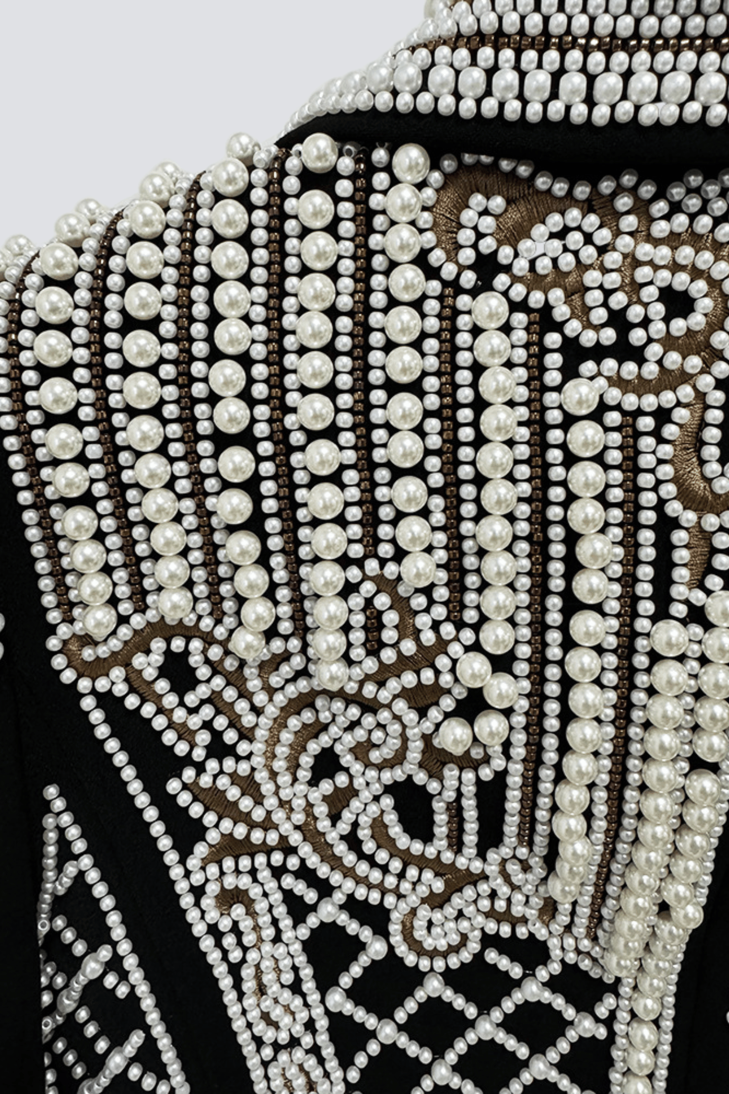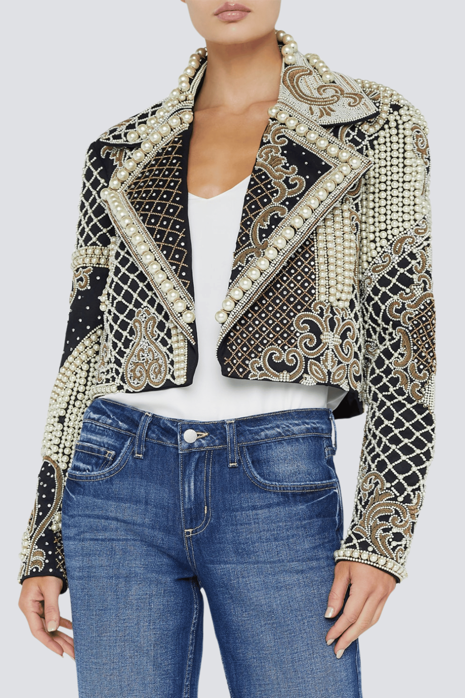 Indulge in the ultimate luxury with our Akili Pearl Embellished Cropped Blazer. This exclusive piece is adorned with delicate pearls, adding a touch of elegance to its cropped silhouette. Elevate any outfit and make a statement with this sophisticated and timeless piece.