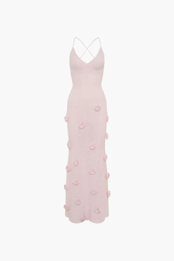- The Alexie dress showcases a sophisticated V-neck design with a form-fitting silhouette that beautifully accentuates curves. The delicate floral appliqué adds a unique and whimsical touch.