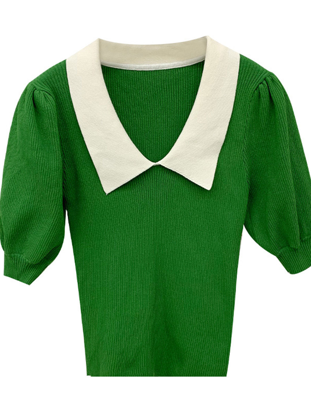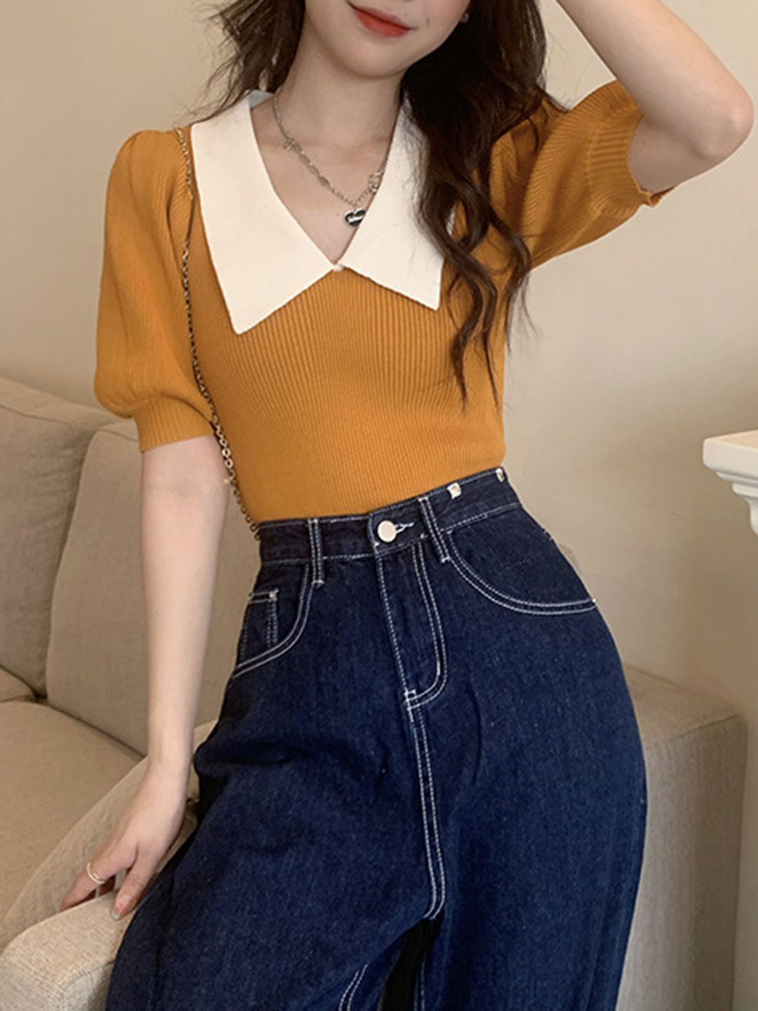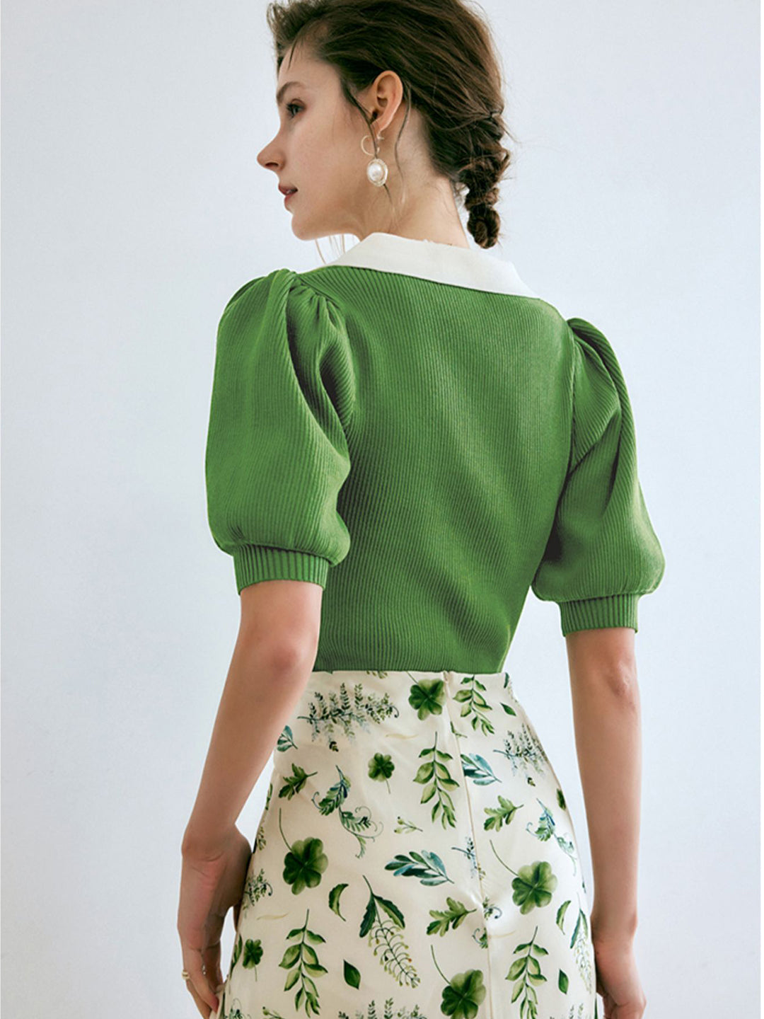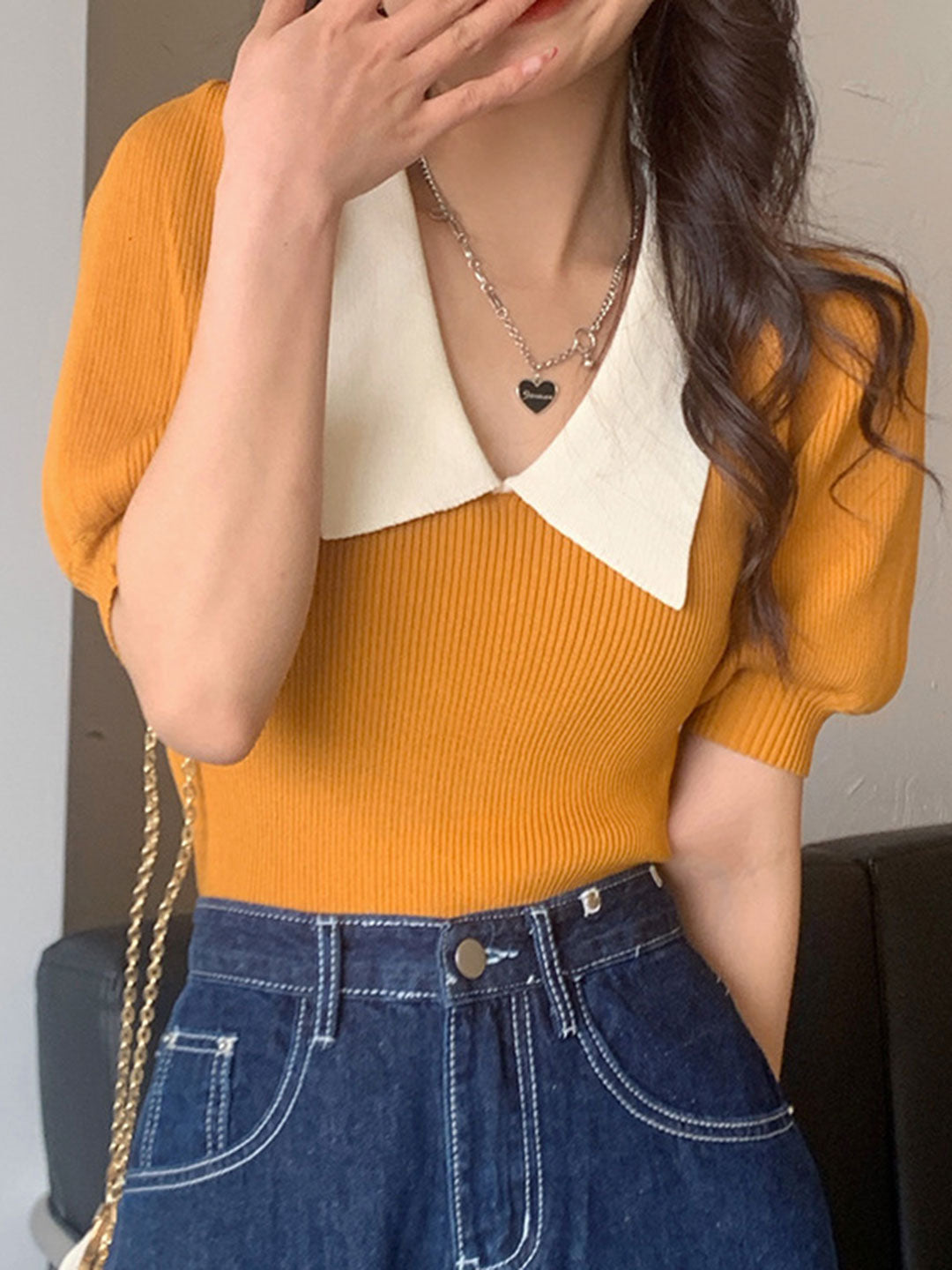 Alexis Retro Lapel Puff Sleeve Knitted Tops-Yellow