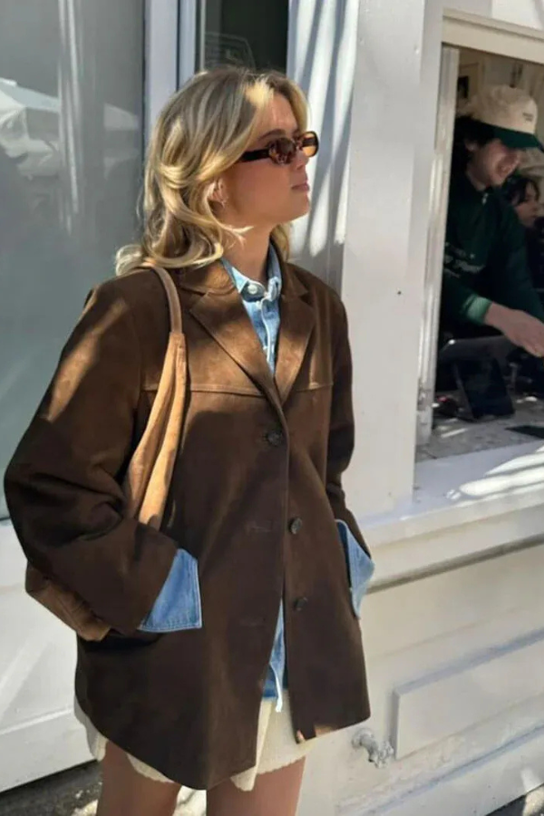 button fastening, roomy fit, shoulder fit front and back, slightly lowered shoulder seams cuff with button fastening. patch pockets at the front, and lined elastic at the bottom, making it perfect for a casual, chic, cool, biker look. With an autumn, casual modern aesthetic, it seamlessly complements your look, whether you're taking a casual stroll or embracing a cool, edgy vibe. Elevate your collection with this essential piece