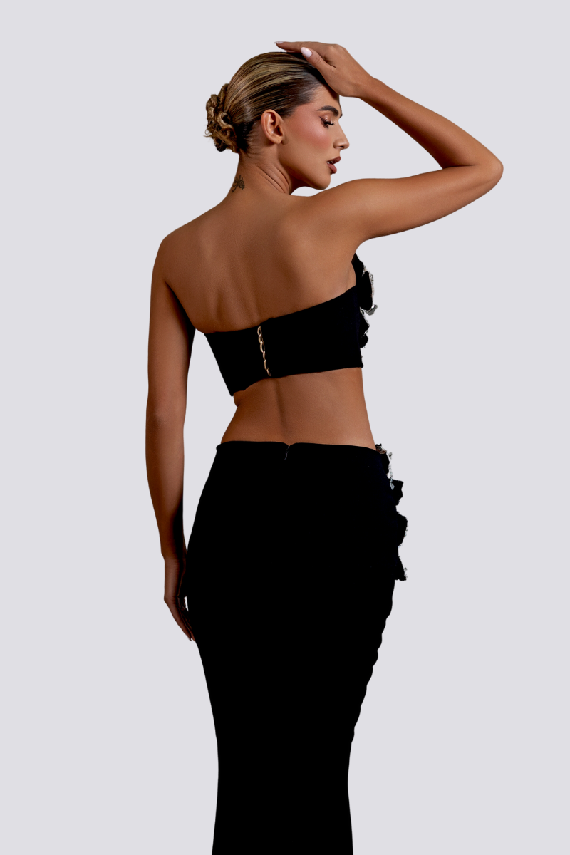 - Design: Strapless crop top with rhinestone floral embellishments paired with a fitted bodycon skirt
