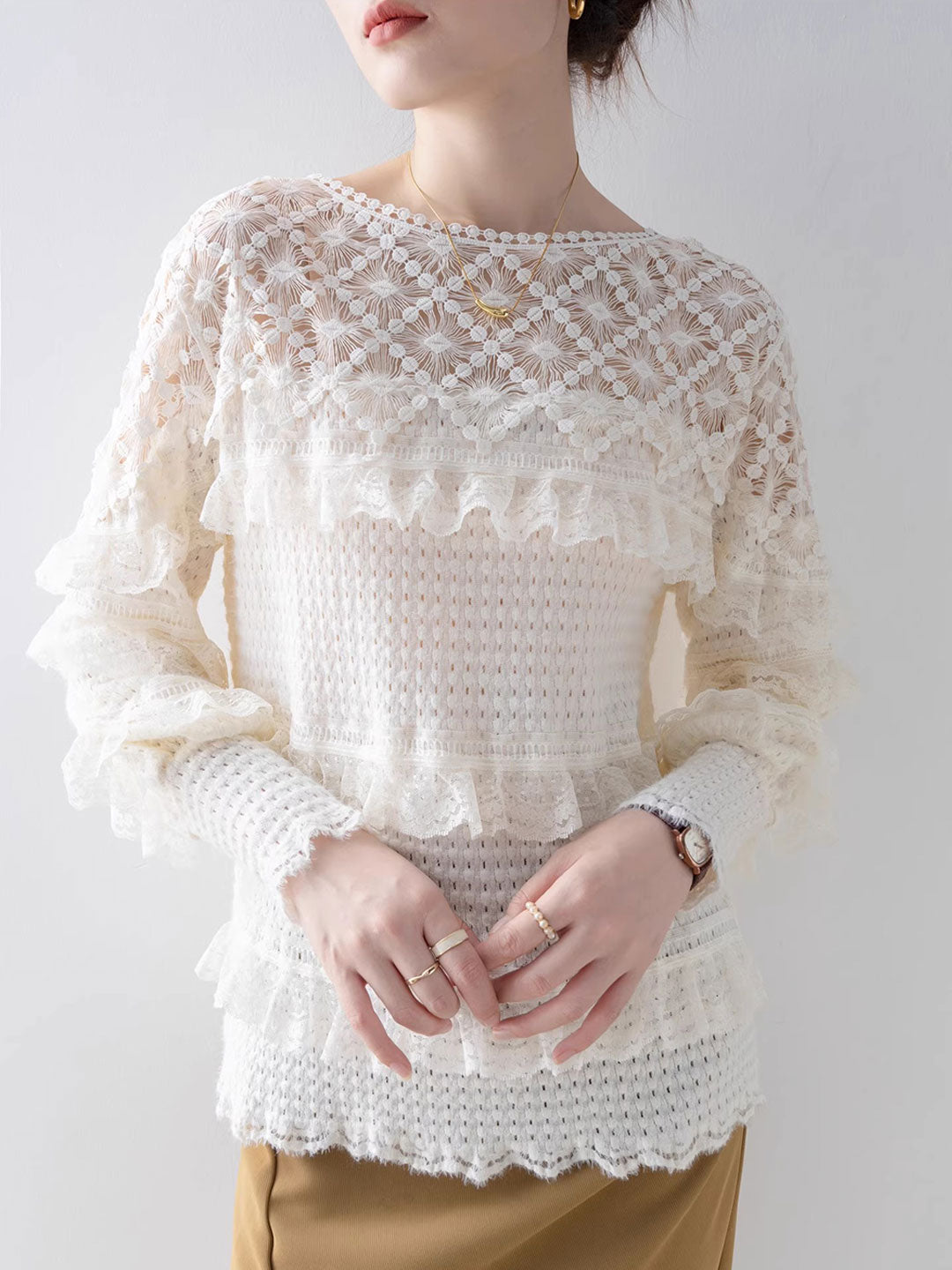 Allison Retro Crew Neck Solid Color Patchwork Lace Top