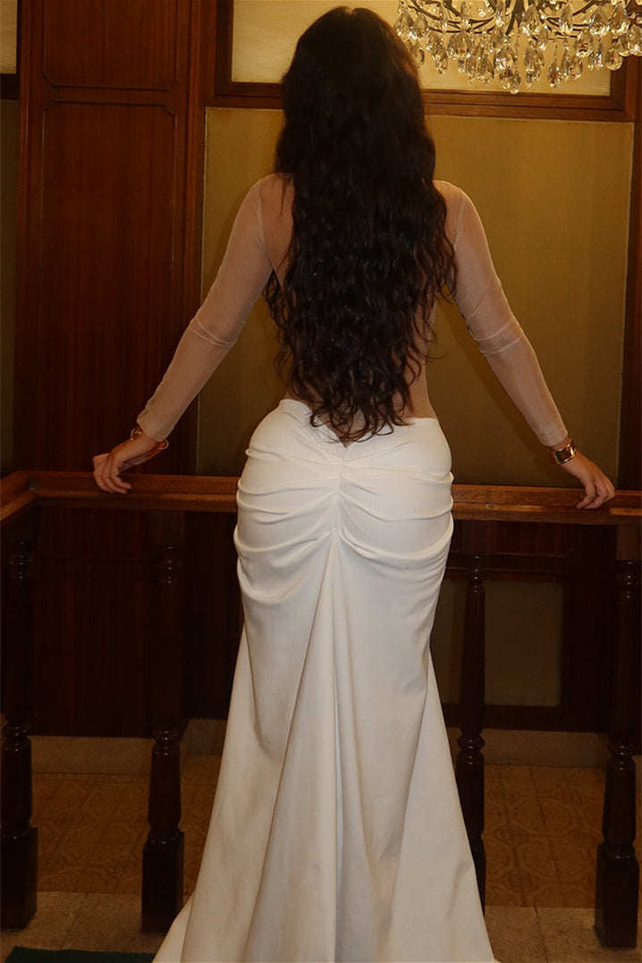 Long Sleeves, Stand-up Collar, Long Draped Train Skirt, Maxi Length.