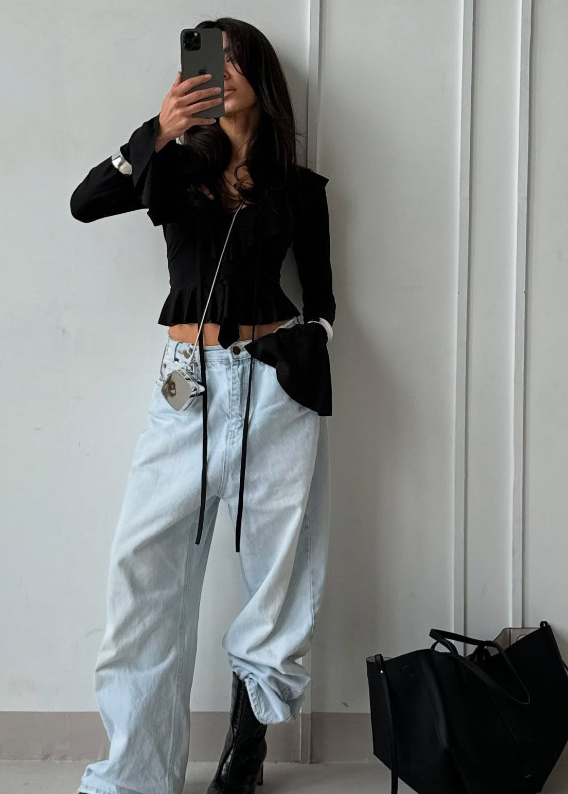 Amaya - Ruffled Tie-Front Long Sleeve Top blends effortless femininity with modern edge. Featuring a deep V-neckline with cascading ruffle details, this top accentuates the silhouette while adding a soft, romantic touch. The adjustable tie-front design allows for a customizable fit, while the long, flared sleeves enhance its refined yet bold aesthetic. Crafted from a stretch fabric that hugs the body, this top pairs beautifully with high-waisted denim or sleek skirts for both casual and dressy looks.