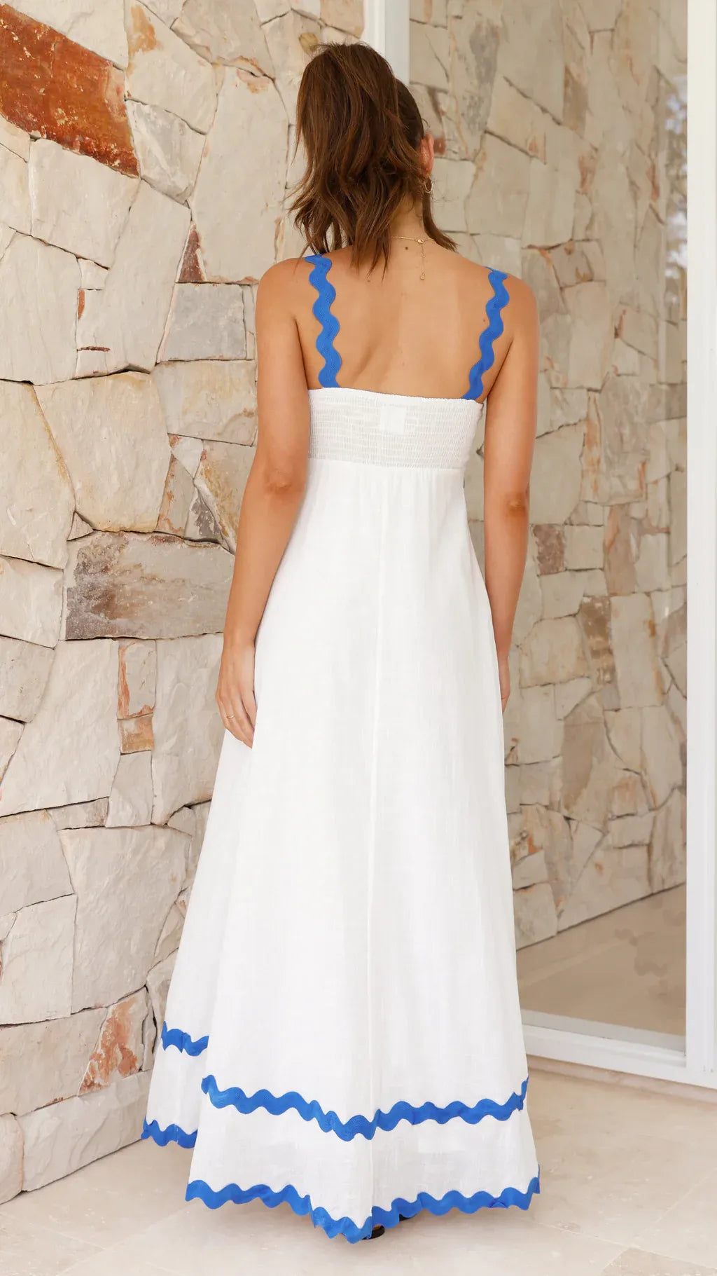Embrace elegance with our Amillia maxi dress, featuring delicate ric rac trim and slender, adjustable straps for a perfect fit. An invisible back zip ensures a seamless look, complemented by a shirred back panel for added comfort. Flaunt your impeccable taste and embrace your femininity with this stunning wardrobe essential.