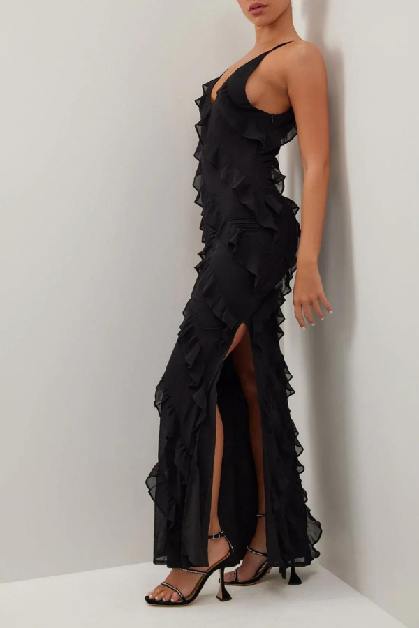 The ruffle zippered long dress can be styled in numerous ways to suit different occasions and preferences.