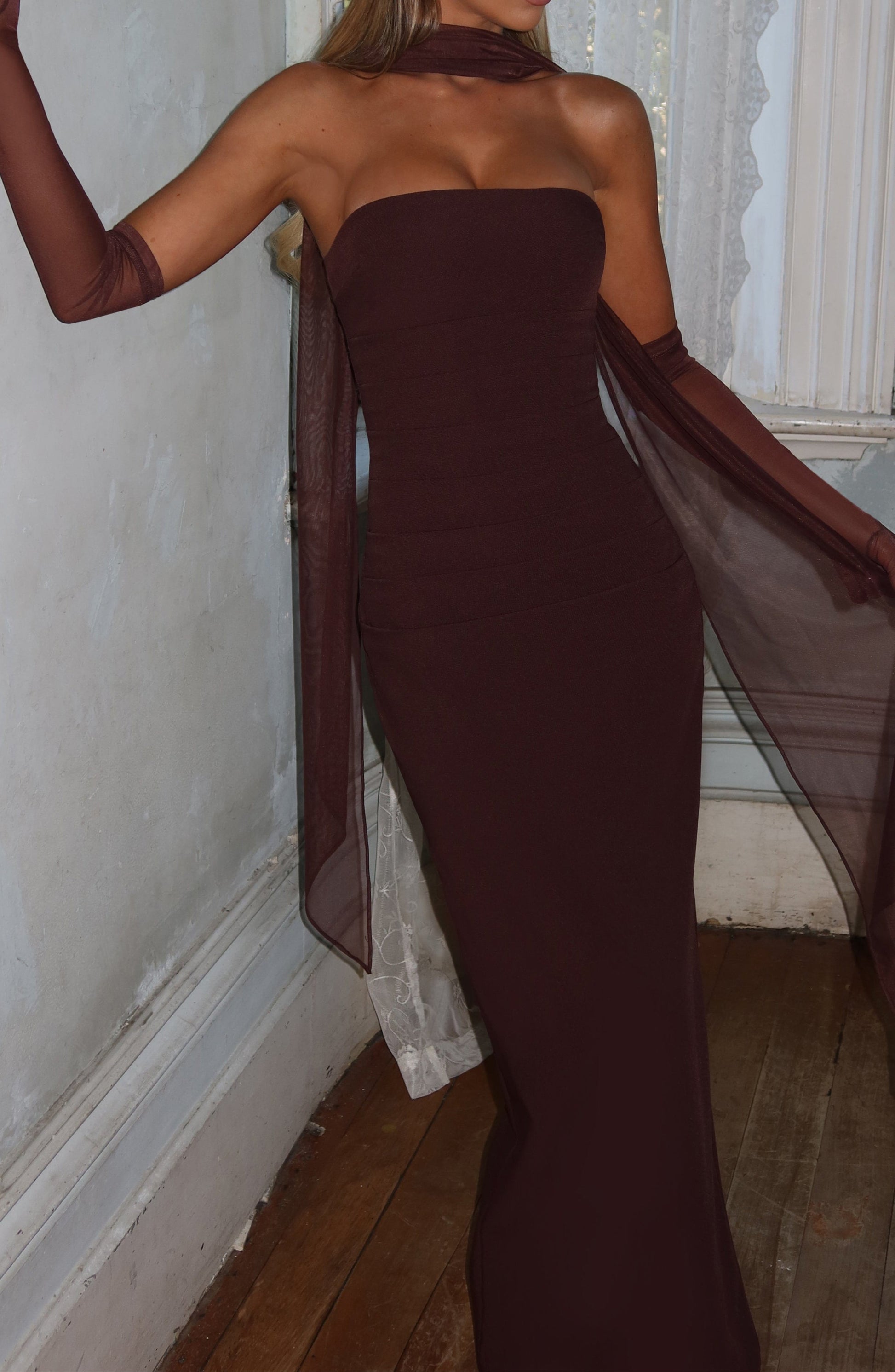 Chic & Complete Ensemble – Pair the Yulia Maxi Dress with the Eli Gloves for a coordinated, high-fashion statement. The deep Plum Brown hue and refined details make it a standout piece for weddings, galas, or any occasion where you want to make an unforgettable impression.