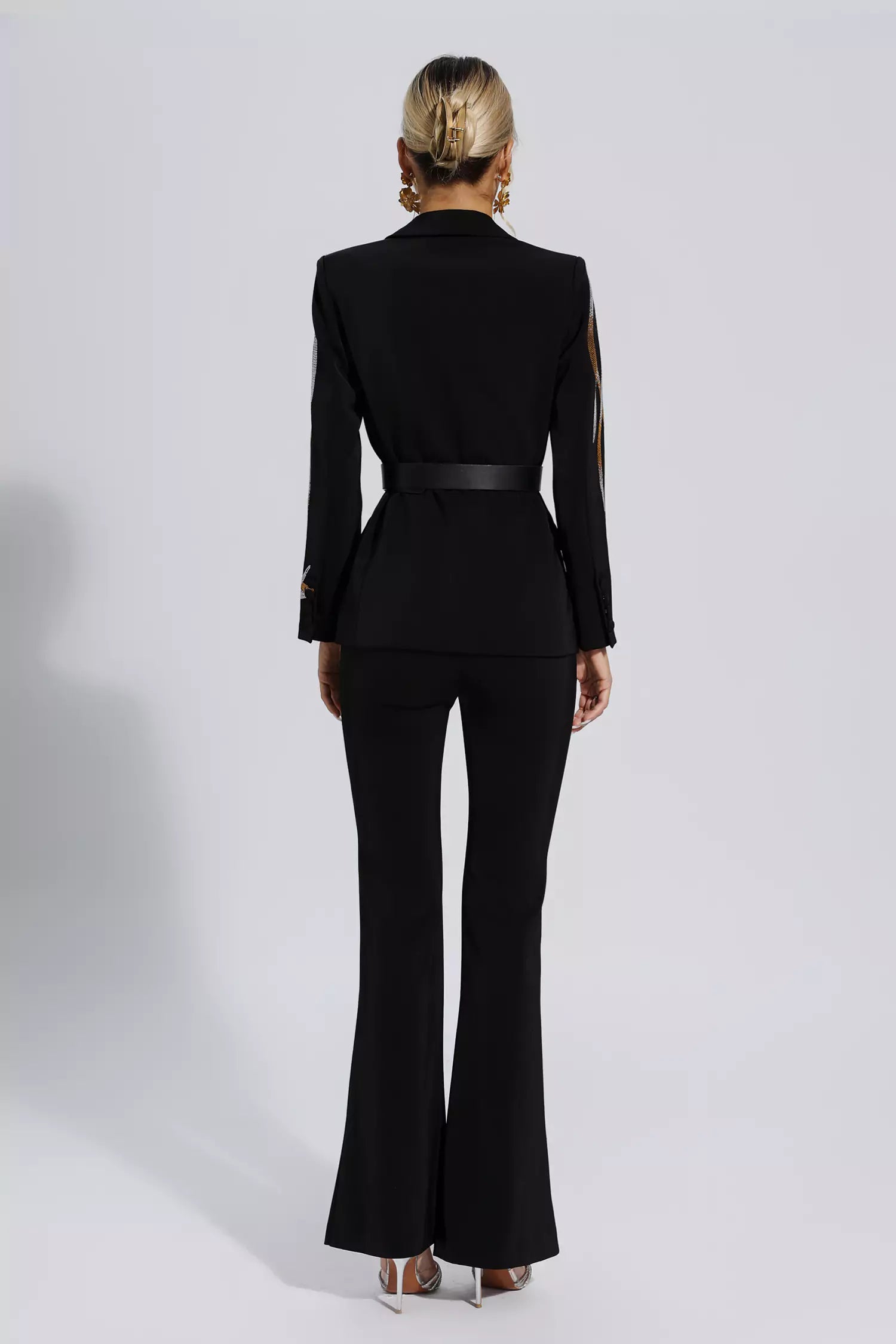 Make a statement with the Analia Black Diamond Sequin Blazer Set, a wardrobe essential. Gold and silver diamonds embellished top with fine tailoring—style with a tie belt to flatter your waist. The lower-body pants are designed with suit button-bell bottoms to show off the long legs. Whether you're attending a vital banquet or workday outfit, this item will be a sure-fire choice.