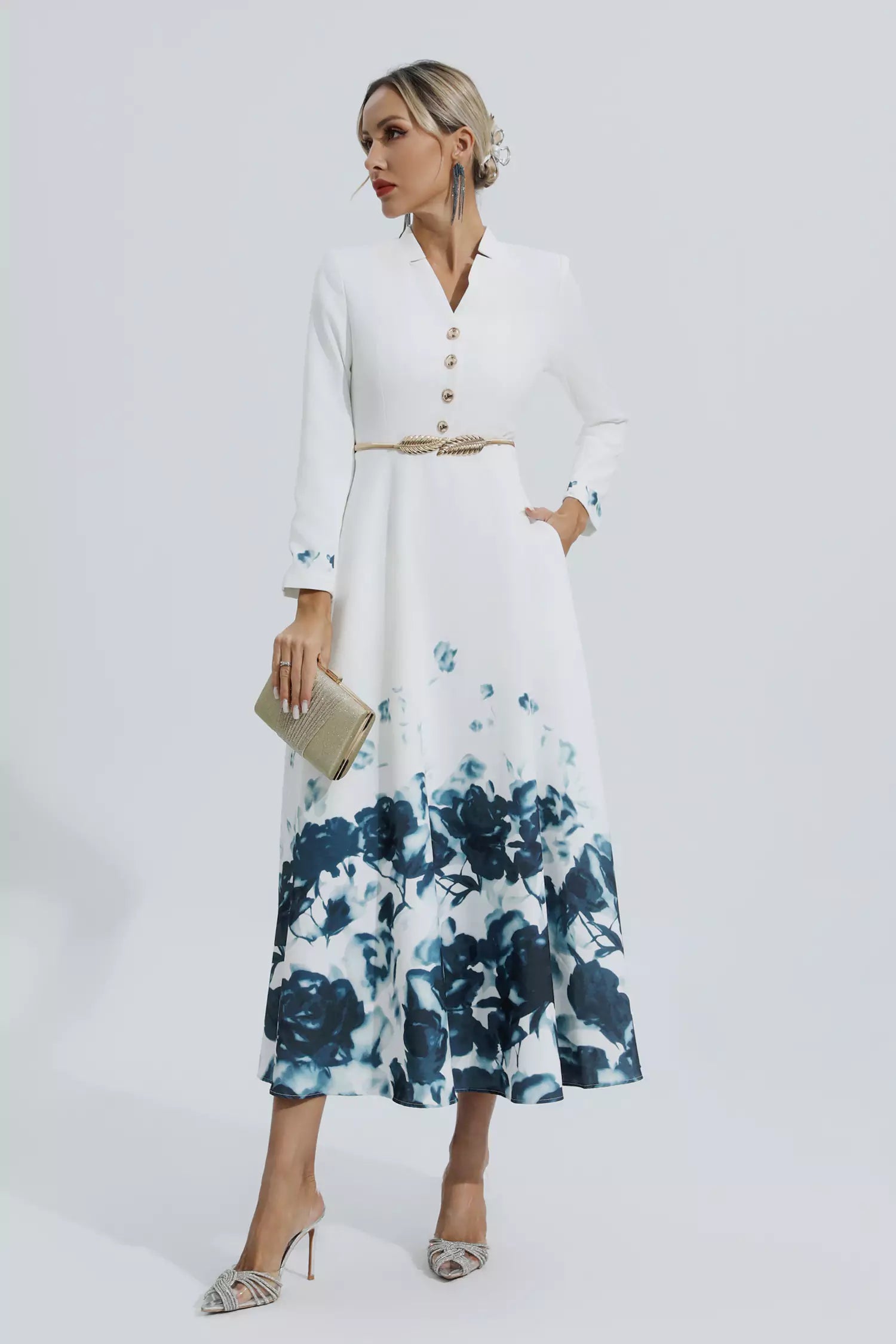 Elevate your style with the Angie White Printed Floral Maxi Dress. The captivating floral print adds a touch of femininity to the alluring blue hue. Complete with a coordinating belt, this dress is a must-have for any fashion-forward woman.