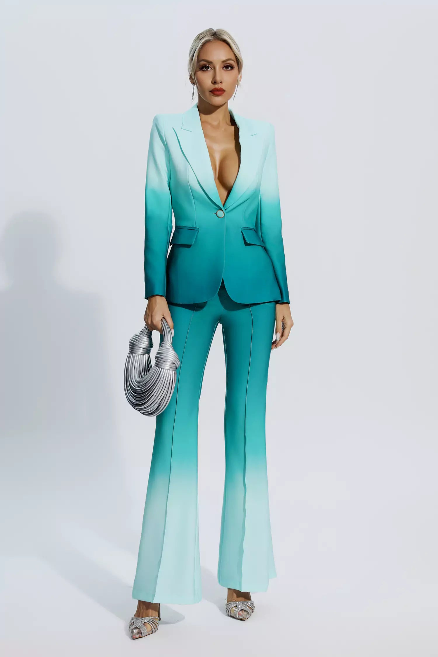 A must-have wardrobe item for the urban glamorous woman is our Anya Gradient Green Blazer Set. Exquisite and simple suit style, paired with a gradient green color, it will make you look elegant. The top is a slim-fit blazer and the bottom is flared trousers. Whether it's the workplace or an important party, you'll look dazzling in this set.