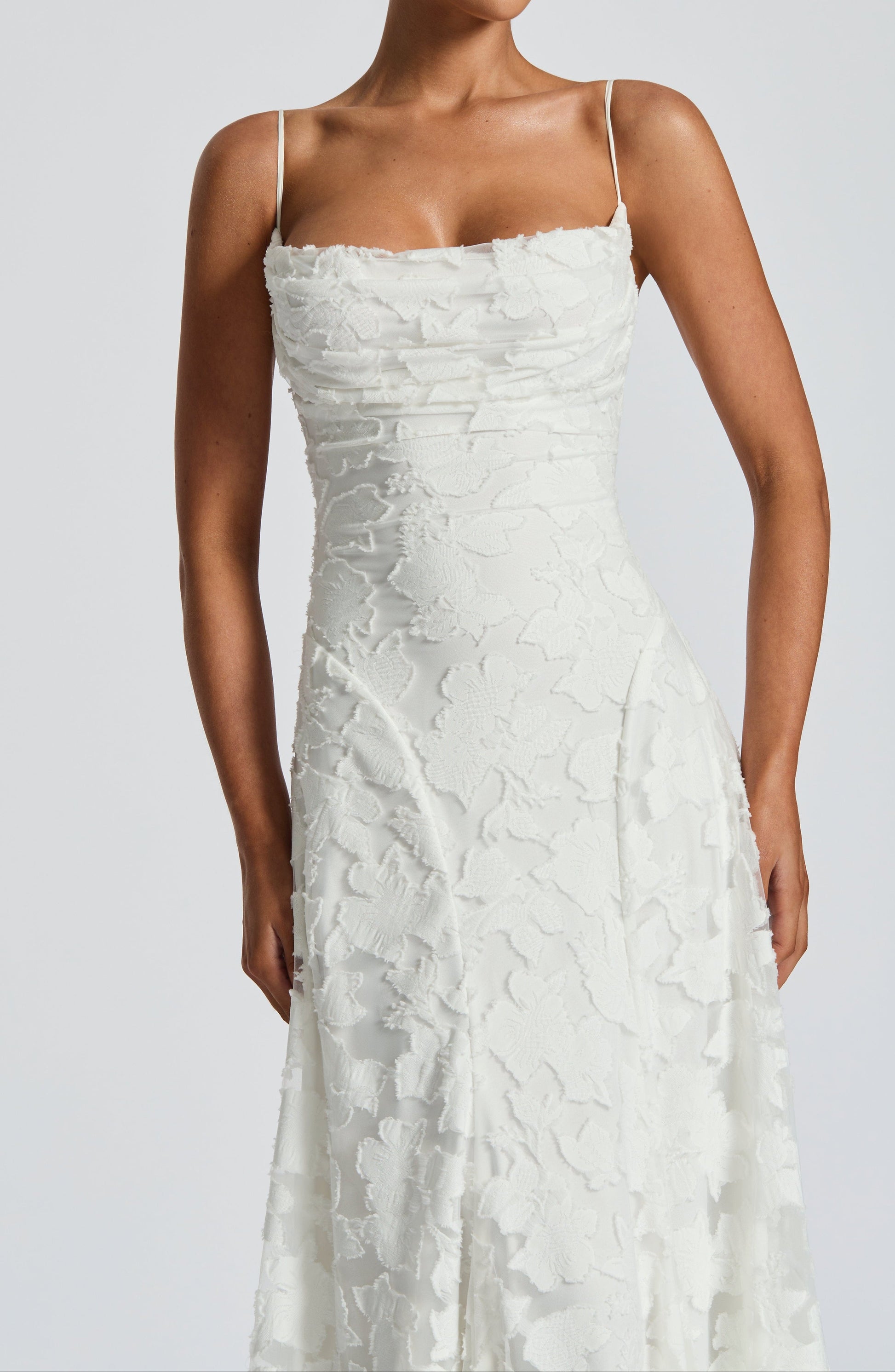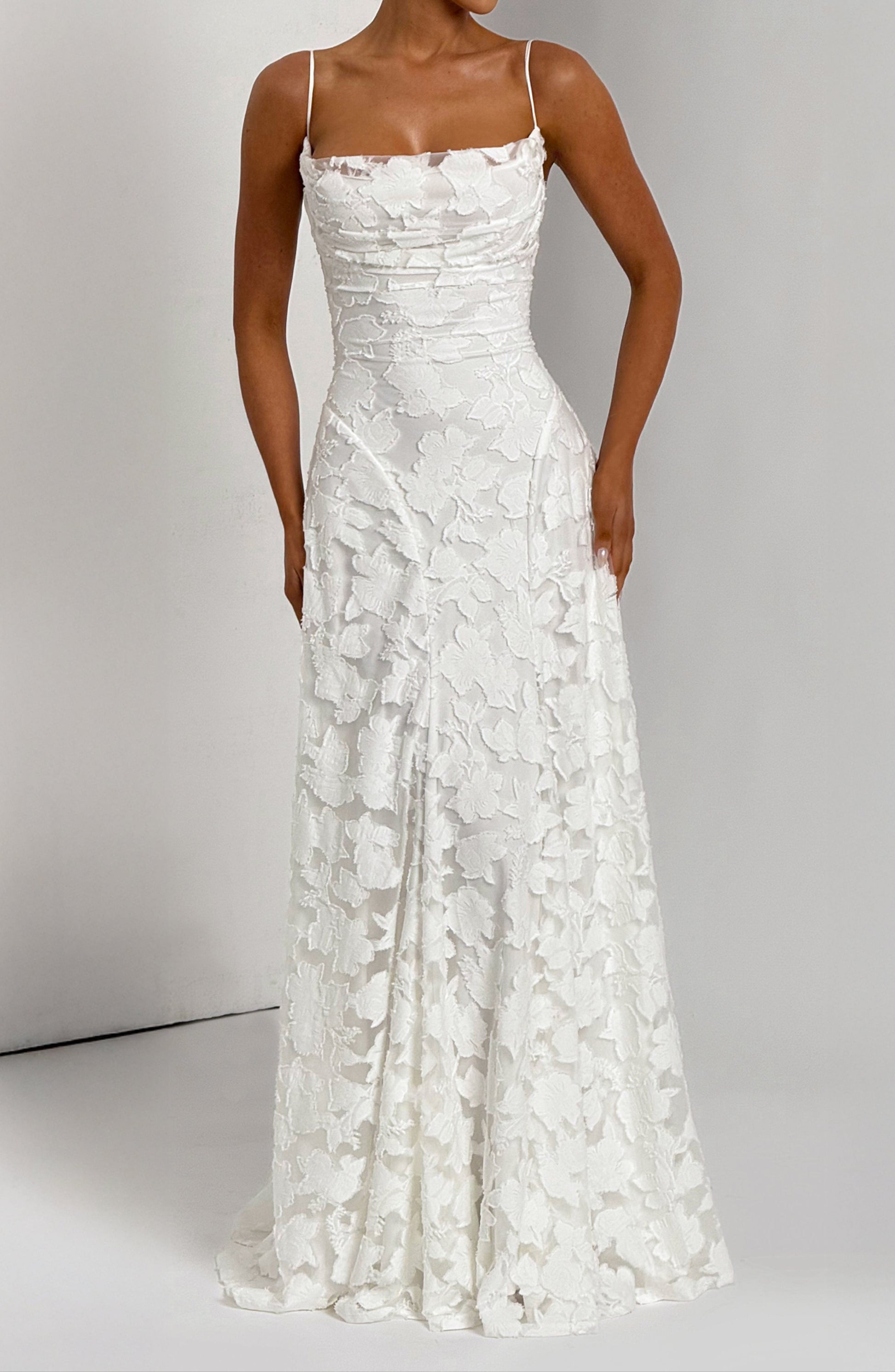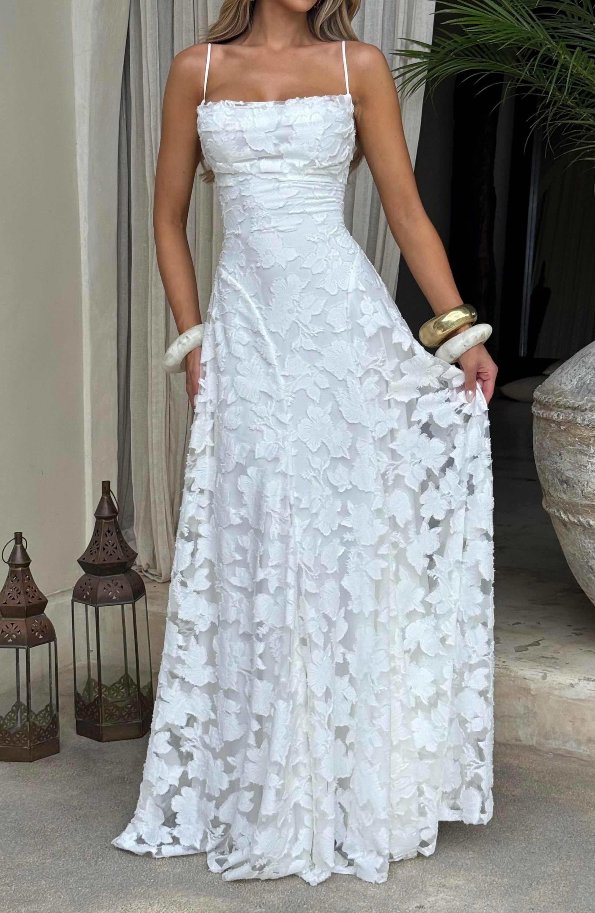 Make a stunning impression in this beautifully crafted maxi dress, featuring a custom floral burnout jersey fabric that exudes effortless sophistication. The flowing silhouette, delicate cowl neckline, and lace-up back create a perfect balance of romance and modern allure.
