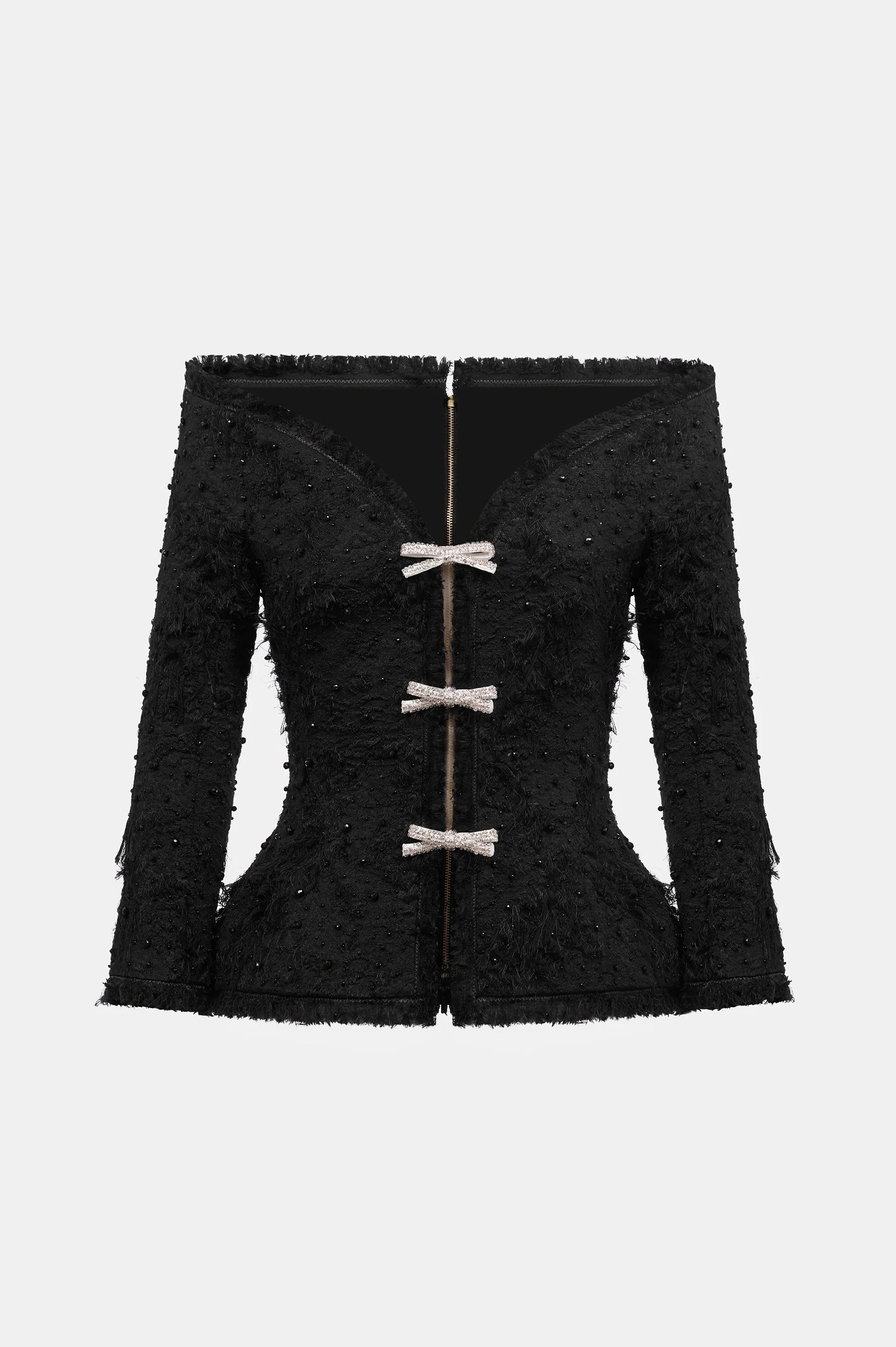 Arife Off Shoulder Bow Crystal Embellished Blazer Two Piece Set - Black