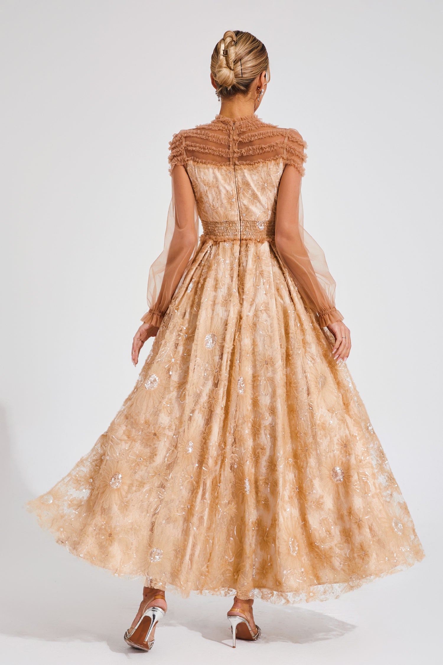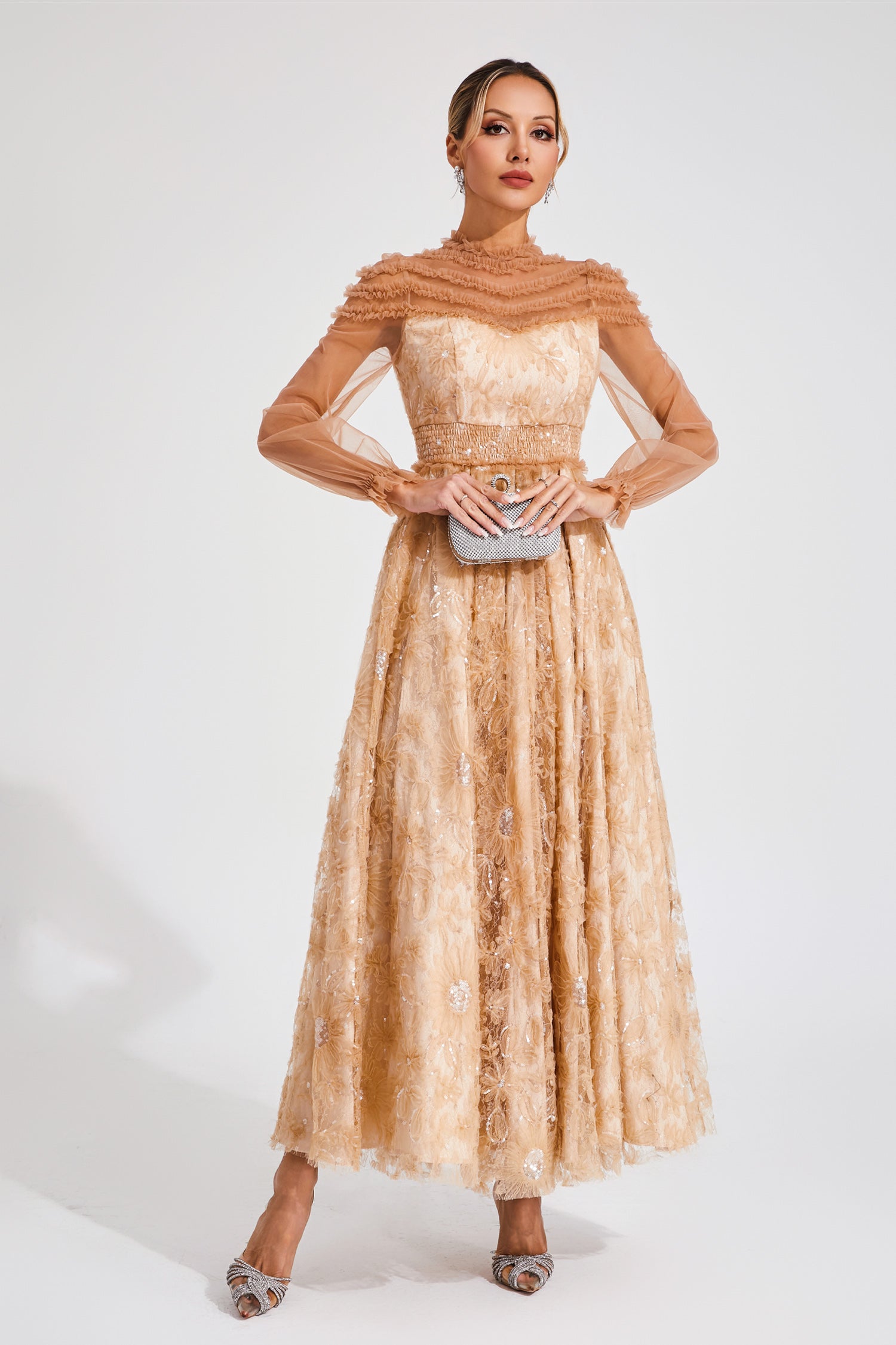 The Attlee Orange Lace Sequins Maxi Dress is a masterpiece of French elegance. Crafted with intricate lace and sparkling sequins, this dress exudes a sweet and romantic charm. With its floral design, long sleeves, and high waist, it effortlessly elongates your figure. Perfect for evening occasions, this dress will make you stand out at any party or formal event.