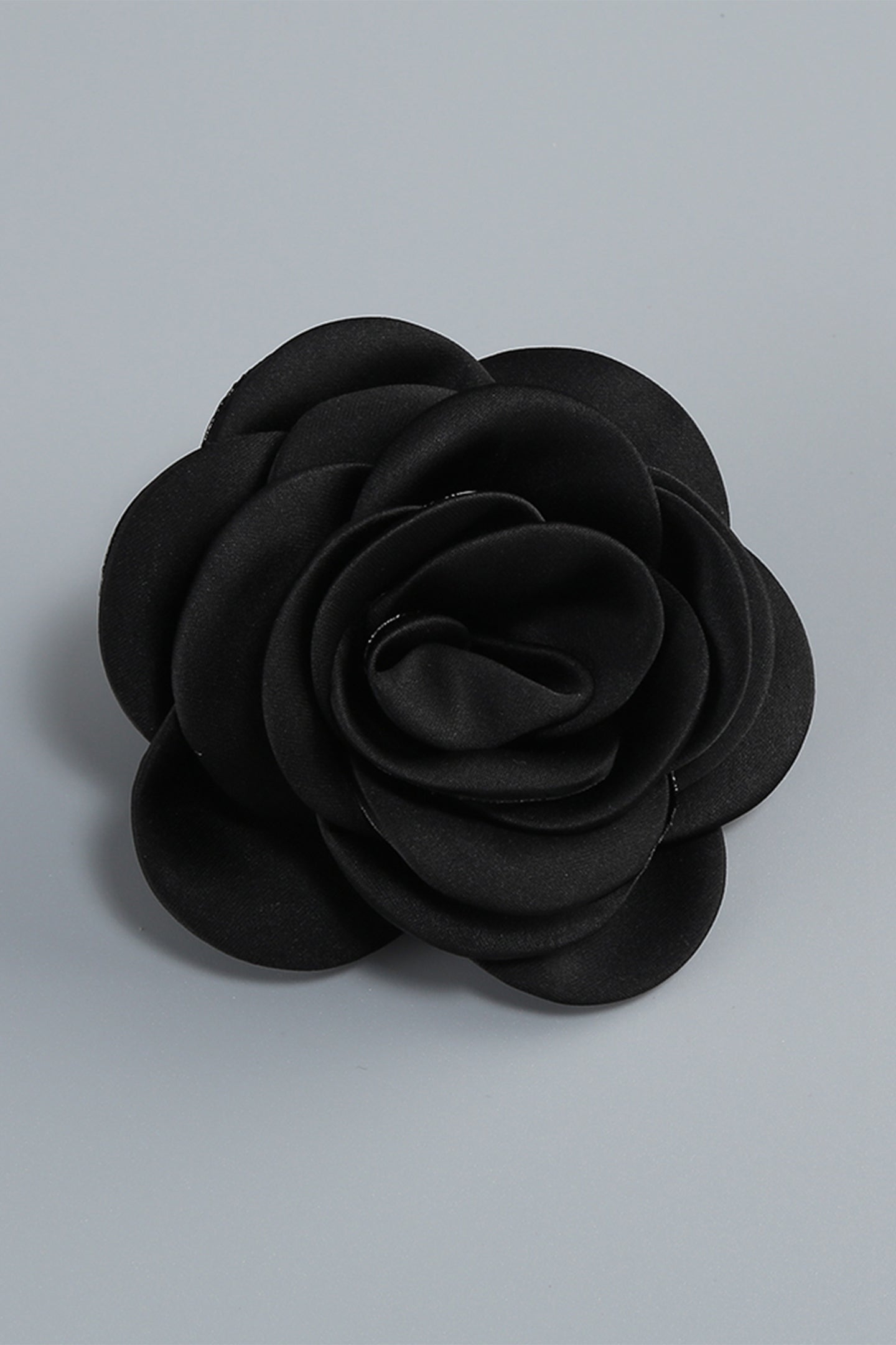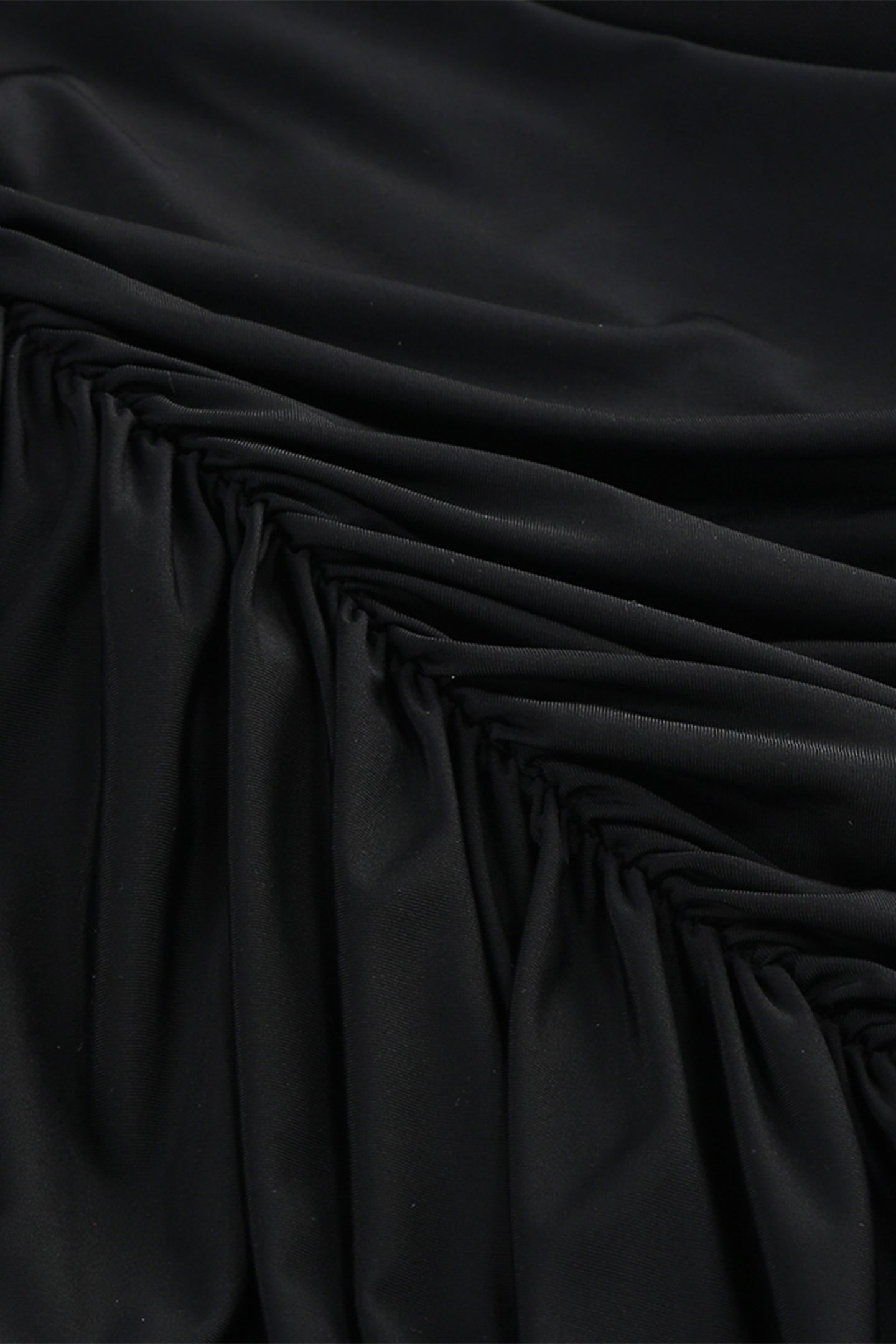 Rose Choker, Ruched Bodice, Faux-fur Cuffs, Straight Hem, Long Sleeves, High Neck, Mini Length.