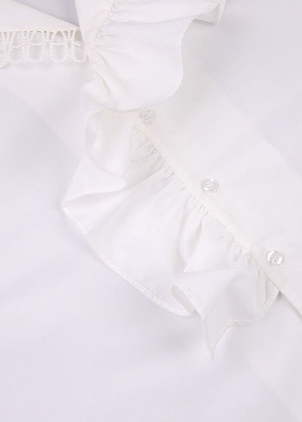 Aurora – Ruffle Trim Long Sleeve Blouse brings a fresh take on feminine style with its deep V-neckline, cascading ruffle front, and voluminous sleeves. Crafted from a lightweight blend of 80% polyester and 20% cotton, it offers breathable comfort while keeping its structured silhouette. The delicate lace-like trim at the cuffs and neckline adds a refined finish. Designed with a relaxed fit, this blouse pairs effortlessly with jeans, tailored pants, or skirts, making it perfect for both casual outings and evening occasions.