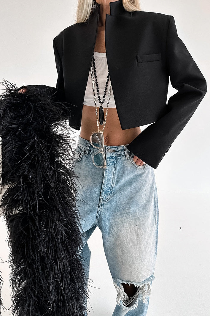 This stylish short blazer with a stand collar offers a unique and modern take on classic tailoring, perfect for the autumn season. Its cropped length and structured design make it versatile and easy to pair with high-waisted trousers or skirts, adding a chic edge to any outfit.
