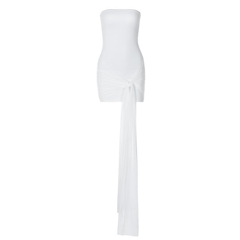 Backless ruched mesh self tie solid tube mini dress